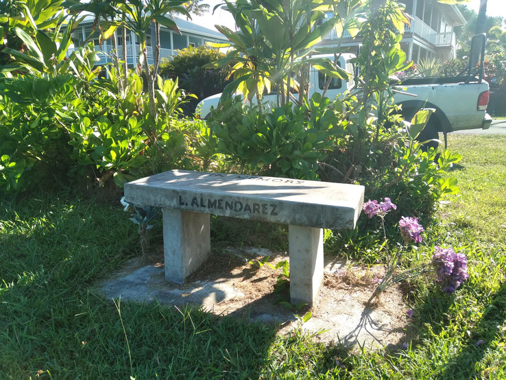 At the park's other end is a picnic bench for those who didn't bring a blanket. There's also a small memorial bench near the road, and in one corner an elegant wood and painted metal bench faces a grove of mature coconut palms, complete with forming coconuts and all. This bench is in a small amphitheater-like area, and is fringed by brilliant, bright-red croton plants.